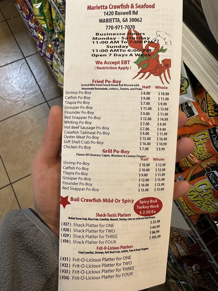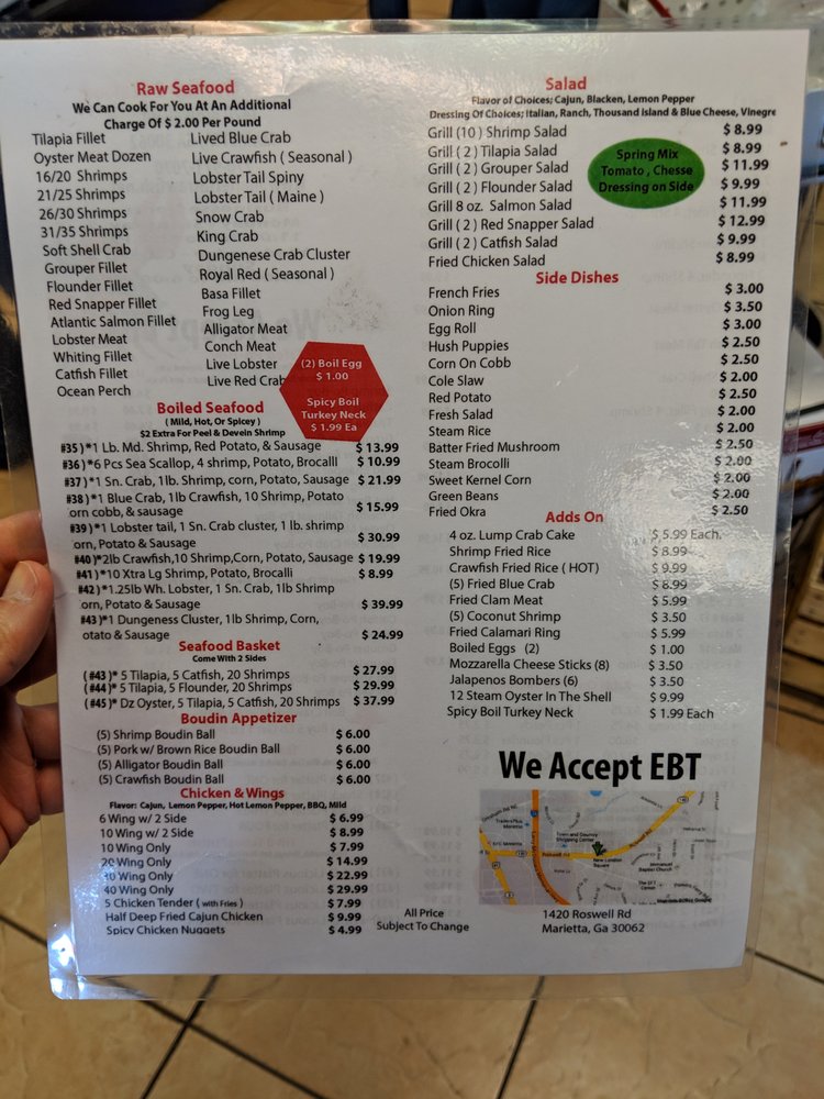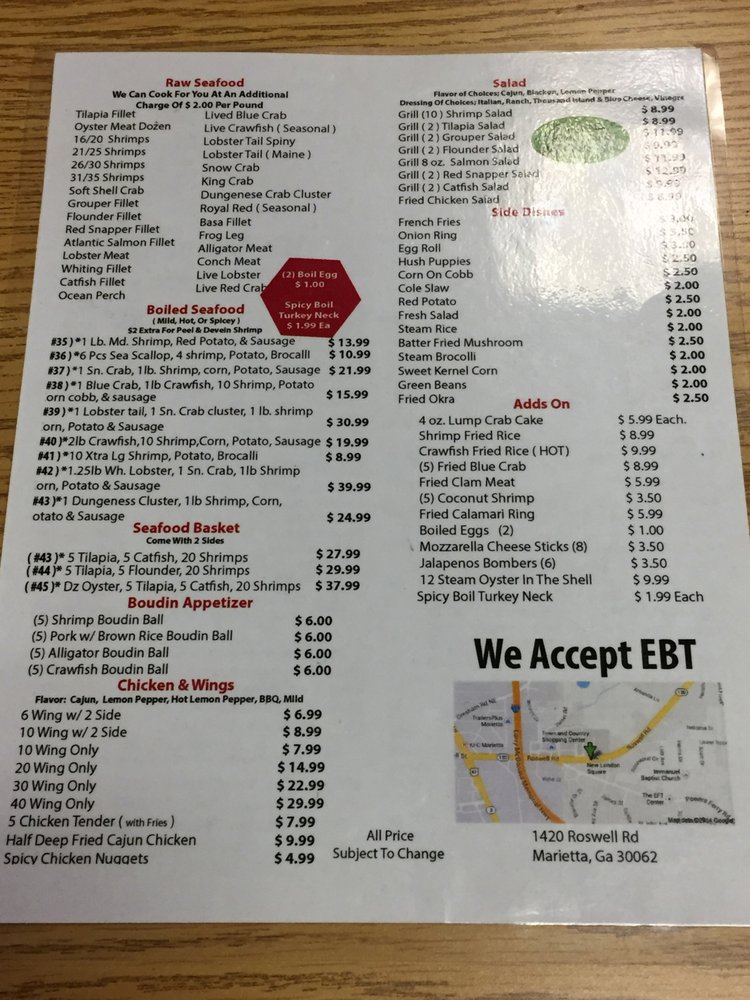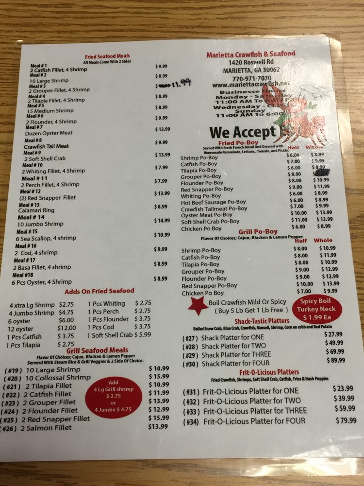 Introducing Marietta Crawfish, a hidden gem in Marietta, GA, offering Cajun/Creole cuisine, chicken wings, and a variety of seafood options. The menu boasts flavorful dishes such as the Grill 2 Red Snapper Salad and Oyster Meat Po-Boy. Customers rave about the top-notch delicious food and great friendly service, with one review highlighting the perfectly spiced and juicy crawfish. While some customers note occasional inconsistencies in spice levels and pricing changes, the overall consensus is positive. Marietta Crawfish is a casual spot perfect for groups, kids, and lunch outings, with amenities like outdoor seating, Wi-Fi, and TV. Whether you're in the mood for seafood or Cajun specialties, Marietta Crawfish promises a memorable dining experience.